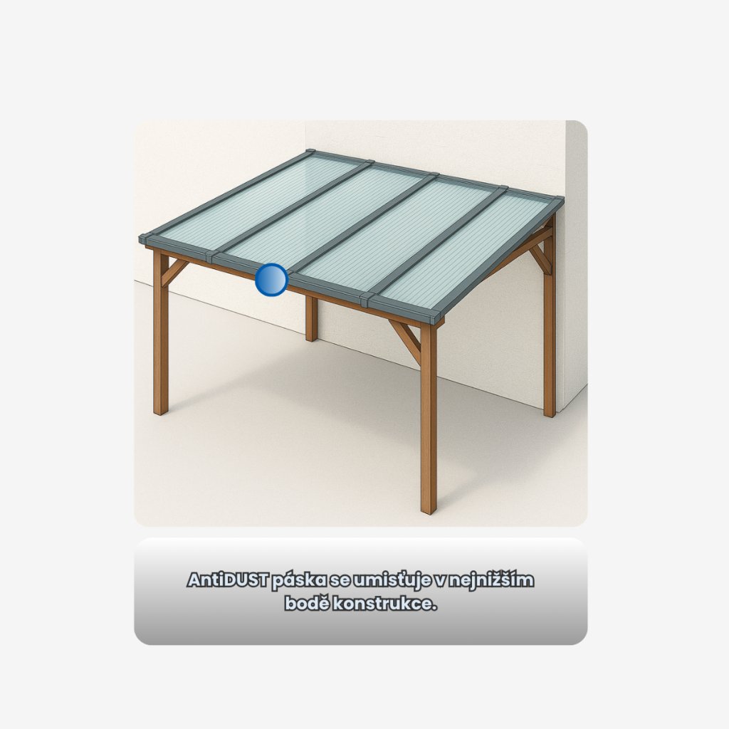 AntiDUST páska slouží k olepení dutinek komůrkových polykarbonátových desek tloušťky 4-10 mm. Vyrobena z pevného netkaného polypropylenu s inovativní konstrukcí, která zabraňuje vnikání prachu a hmyzu do komůrek, zároveň však propouští vzniklý kondenzát ven z komůrek. Díky této vlastnosti zajišťuje dlouhodobou funkčnost a čistotu polykarbonátových desek.