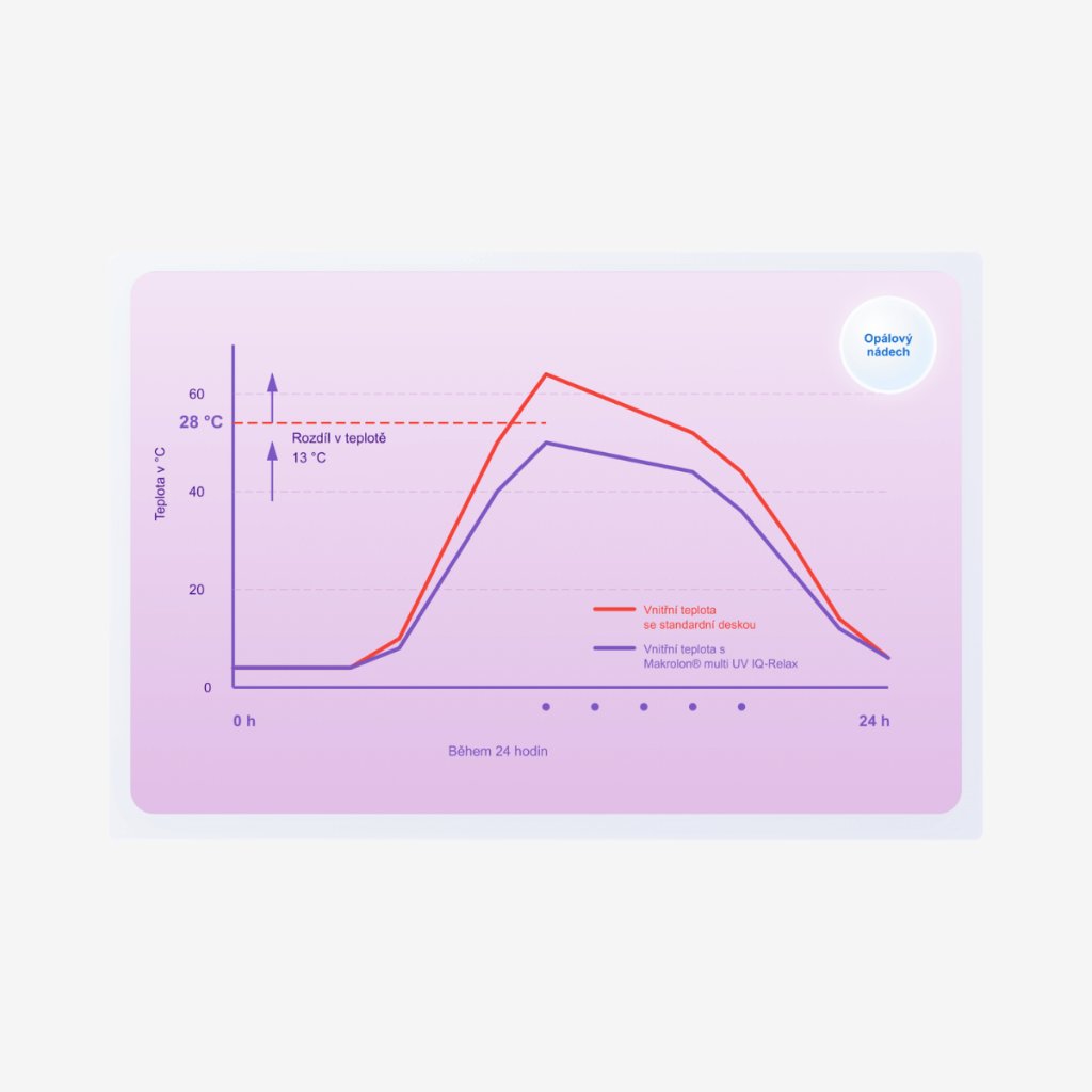 Reálné testy v nevětraných zimních zahradách prokázaly výjimečné snížení teploty až o 13°C ve srovnání se standardními opálovými deskami. To znamená vynikající výsledek, který zaručuje příjemnou pokojovou teplotu nezávisle na počasí. Mimořádný homogenní nárůst světla vytváří komfortní "světelnou atmosféru".
