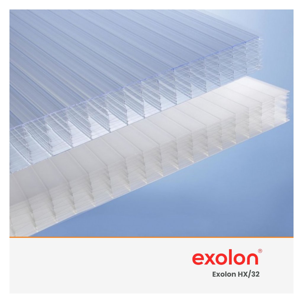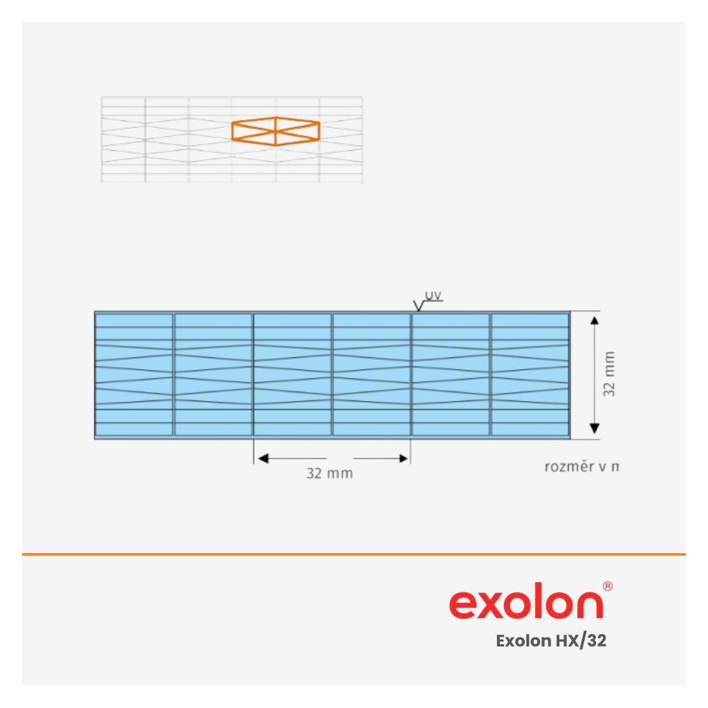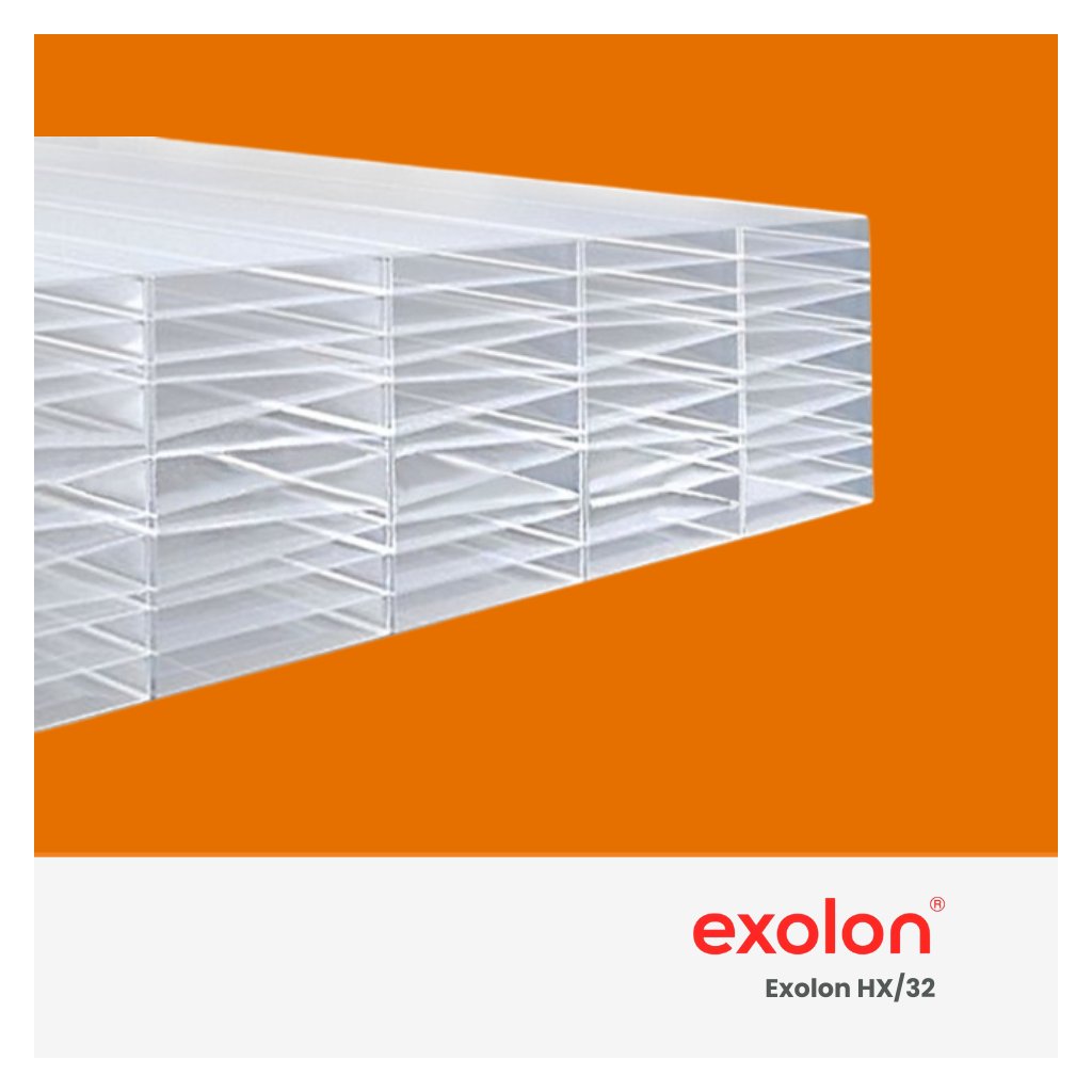 Komůrkový polykarbonát Exolon® HX/32 představuje vícestěnnou polykarbonátovou desku o tloušťce 32 mm s pokročilou vnitřní strukturou HX (Hybrid-X), která zajišťuje větší tuhost a mechanickou odolnost. Materiál od výhradního výrobce Exolon (dříve Covestro) kombinuje dobrou nosnost s výbornou tepelnou izolací.