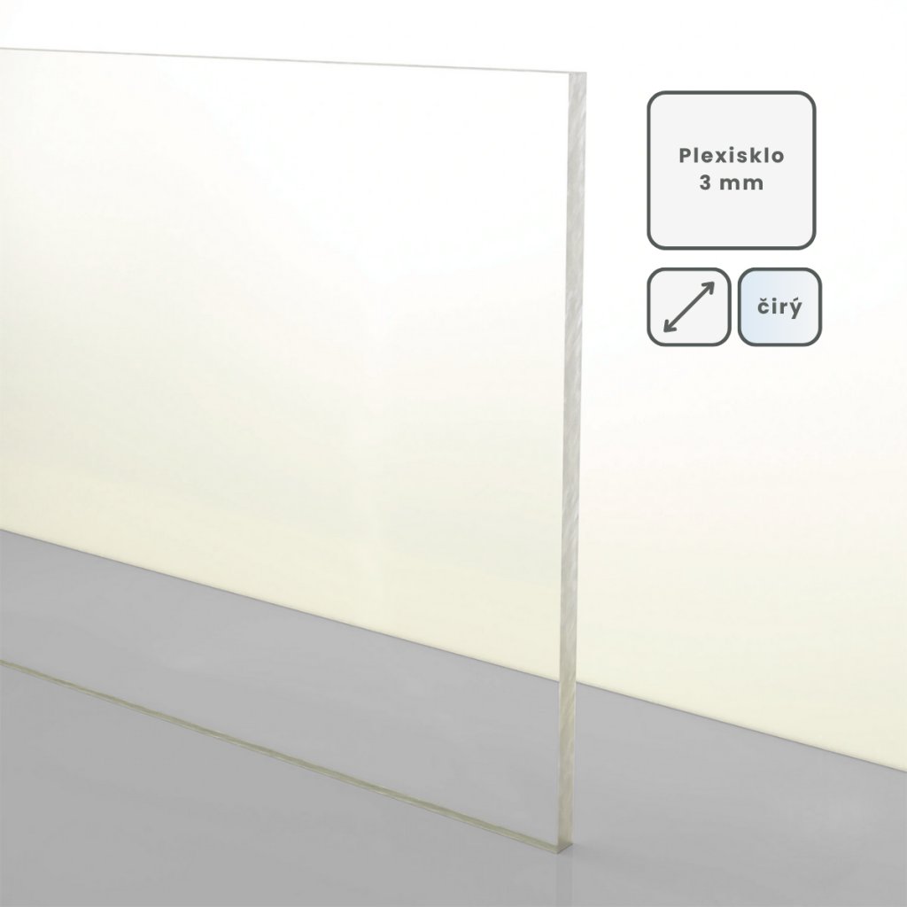 Čiré plexisklo tloušťky 3 mm patří k nejpoužívanějším deskám z PMMA. Povrch je z obou stran hladký a vysoce lesklý, chráněný ochrannou fólií. Desky jsou vyráběny metodou extruze – vytlačováním mezi dvěma rotujícími válci. Díky tomu mají minimální tloušťkovou toleranci a rovnoměrnou strukturu materiálu.