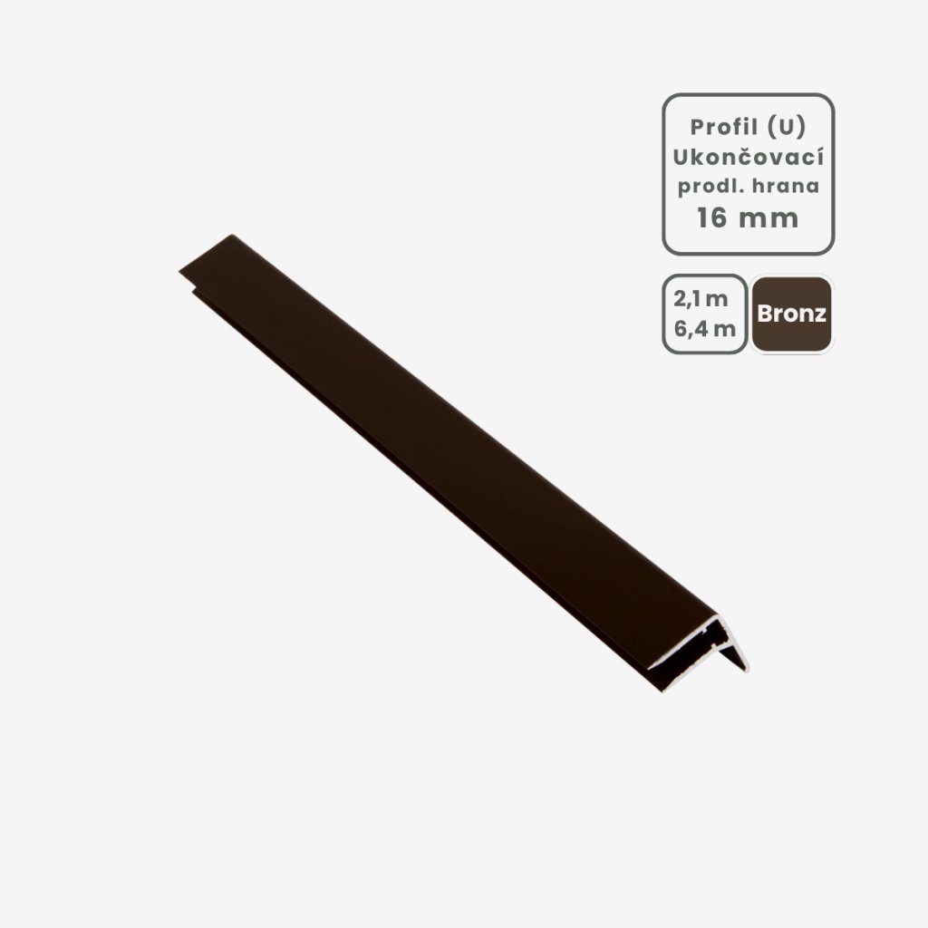 Ukončovací AL "U" profil s predĺženou hranou 16mm v hnedom eloxe je pokročilým riešením pre náročnejšie aplikácie, kde je potrebná zvýšená ochrana a lepší estetický vzhľad. Predĺžená hrana zabezpečuje spoľahlivejšie tesnenie a ochranu.