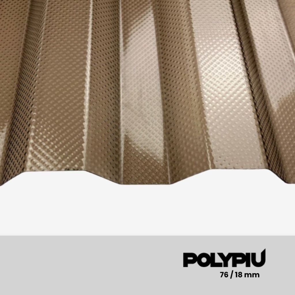 Trapézový polykarbonát LightPiù s tloušťkou 0,9 mm a mikroprizmatickou strukturou v bronzovém provedení je ideálním řešením pro aplikace s požadavkem na optimální rozptyl světla, příjemné stínění a vysokou mechanickou odolnost.